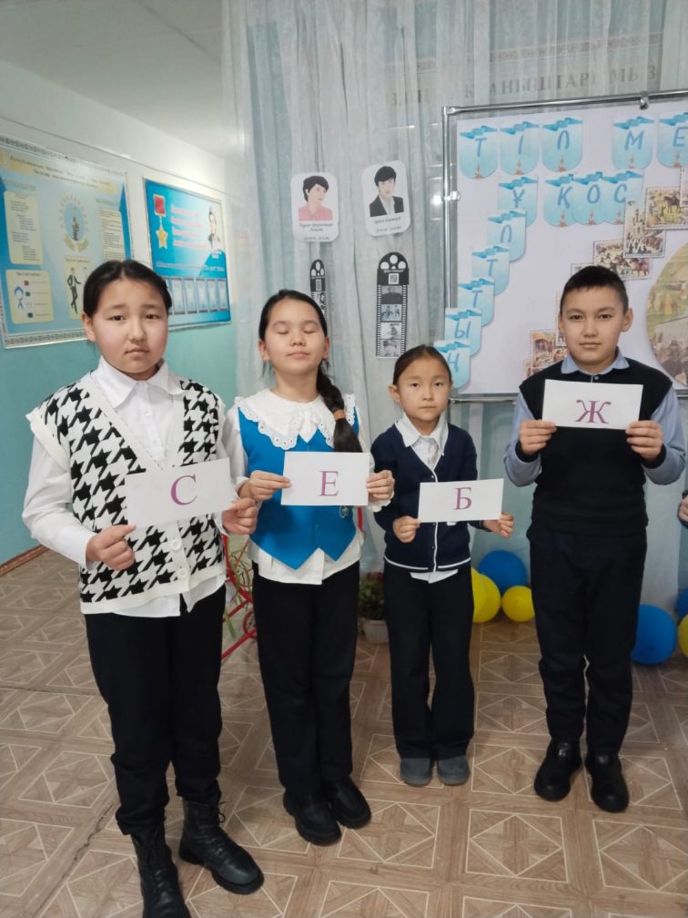 Бастауыш сынып оқушыларымен "Өнегелі 15минут"өтті."Әріптермен жауап бер"ойыны барысында кез келген қойылған сұрақтарға оқушылар қолдарындағы әріптермен жауап берді.Бұл ойын олардың жылдам ойлау,зейн қою және логикалық ойлау қабілеттерін дамытты.Оқушылар белсенді қатысып,өз білімдерімен тапқырлықтарын көрсете алды.